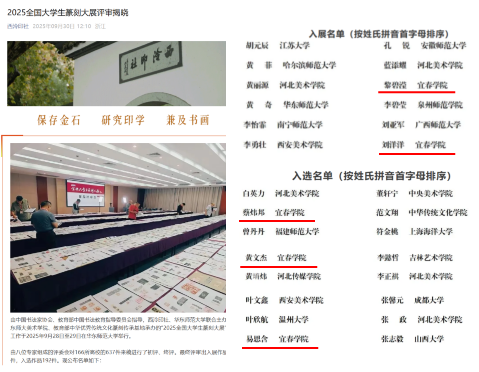 9月30日,2025全国大学生篆刻大展评审揭晓,美术与书法学院书法学专业本科生黎碧滢、刘洋洋2位同学篆刻作品入展(最高奖),蔡炜邦、黄文杰、易思含3位同学篆刻作品入选。