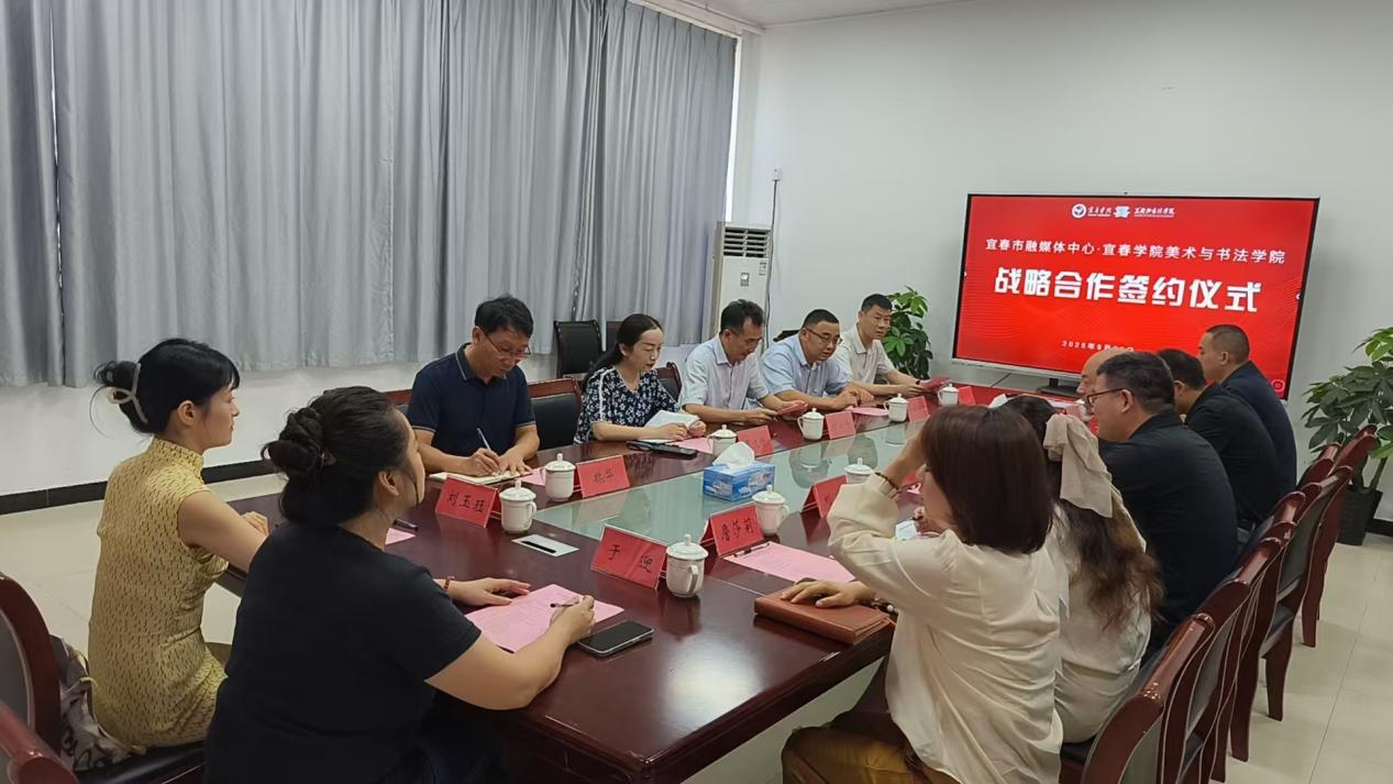近日,宜春学院美术与书法学院与宜春市融媒体中心战略合作签约仪式在宜春学院厚德校区博学楼114会议室成功举行。宜春市融媒体中心主任谢小平,总编辑欧阳新建,副主任罗文静,专职编委、视频制作部主任黎向农,经管部主任魏华;宜春学院科研处副处长袁杰辉,美术与书法学院院长杨礼浪,党委书记俞燎宏,办公室主任易凯以及各教研室主任出席、参加会议。签约仪式由宜春学院美术与书法学院院长杨礼浪主持。