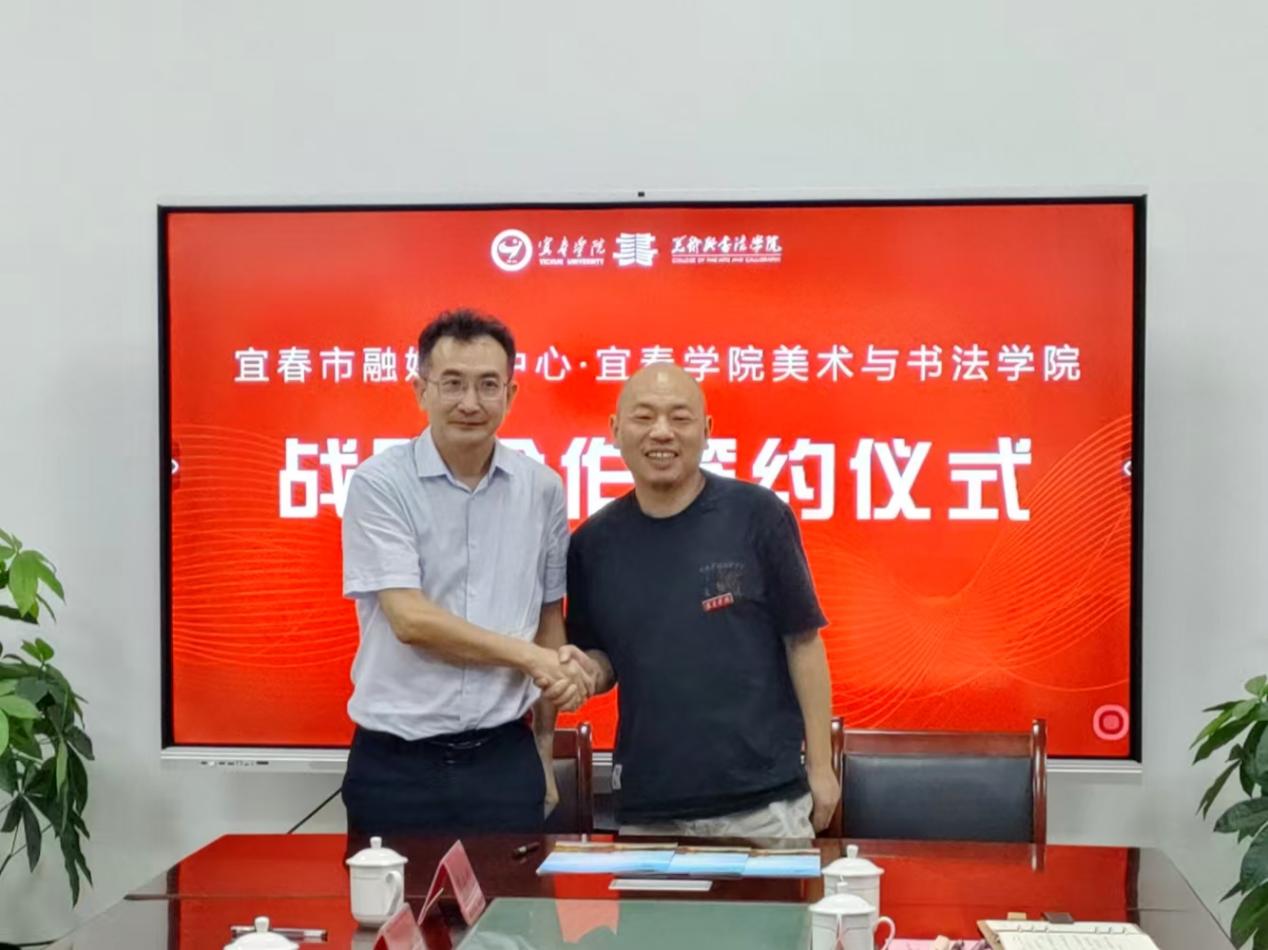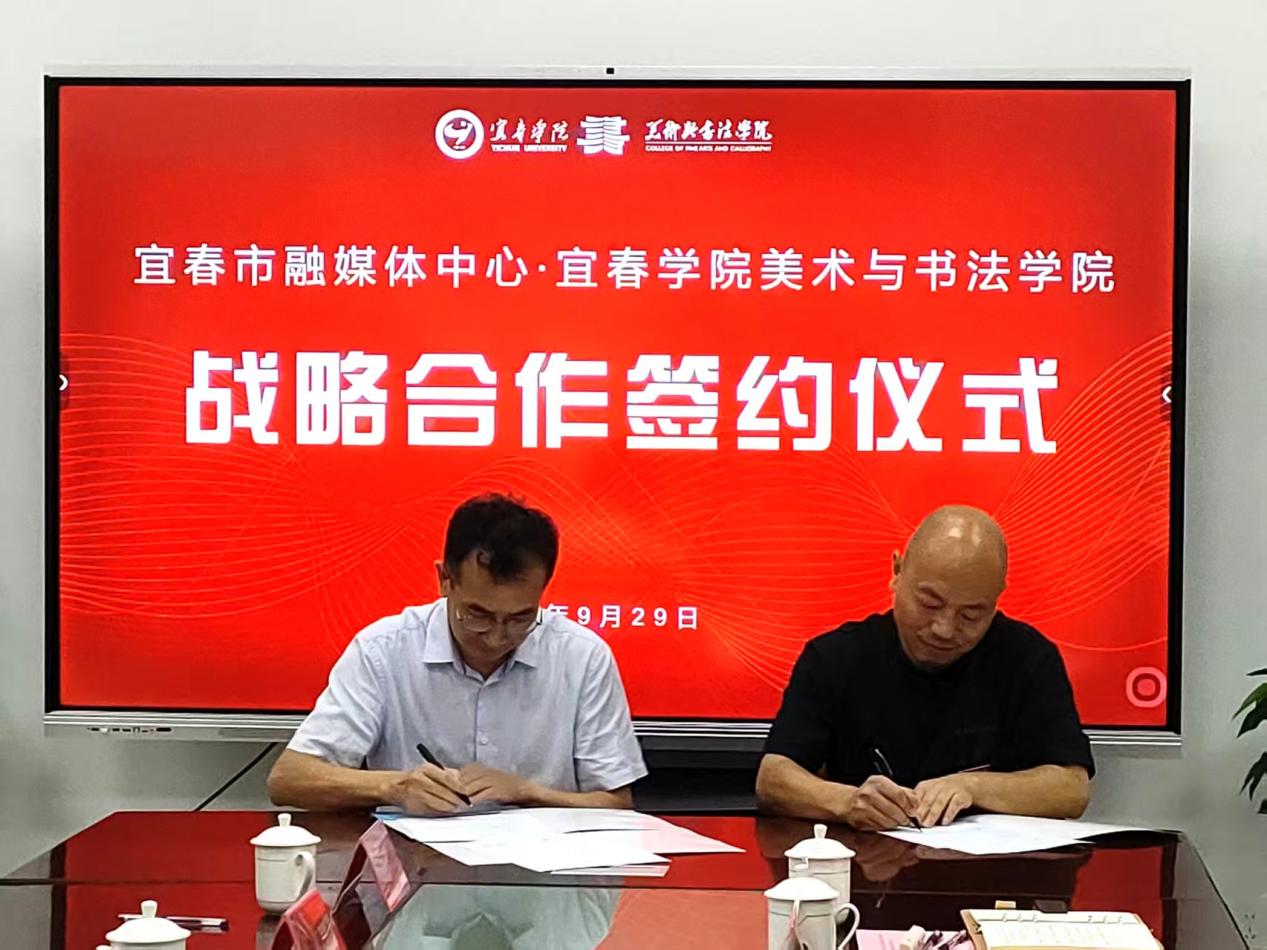 在与会人员的共同见证下,谢小平主任与杨礼浪院长分别代表宜春市融媒体中心和宜春学院美术与书法学院在战略合作协议上郑重签字。根据协议,双方将充分整合美术与书法学院在美术学、环境设计、视觉传达设计、书法学等专业领域的深厚学术积淀与艺术创作优势,以及宜春市融媒体中心的全媒体平台资源和现代化传播力量,围绕宜春地域文化特色,共同策划并实施一系列高质量的文化艺术项目。